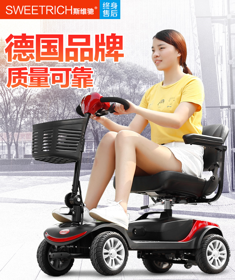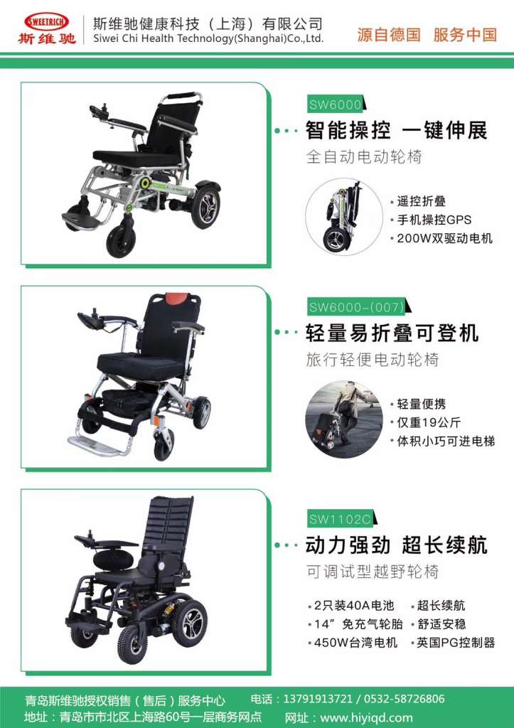4、使用電動輪椅代步車注意事項 (1)要求使用者的視力、聽力、智力、精神狀態良好。 (2)使用前要進行路面操作訓練,熟悉操作后才能上路。 (3)上下輪椅前必須檢查控制器是否關閉,以防止車體移動。 (4)上下坡,轉彎時要恰當控制速度,以保證安全。 (5)充電要嚴格遵循使用說明書,避免發生危險。 (6)定期充電,避免虧電存放,以保證電動輪椅代步車正常的續航能力。 (7)定期檢查各個零部件,避免松動。 5、推薦幾款適合老年人的電動輪椅代步車產品: (1)斯維馳SW6000全自動折疊型電動輪椅:這是一款適合中老年人的電動輪椅,折疊方便,可實現一鍵全自動折疊和手機遙控行走和折疊功能,鋰電池20AH續航里程25公里。便拆型電池可以把電池擰上樓充電,車架保修3年,非常適合經常需要折疊搬動的老年人。