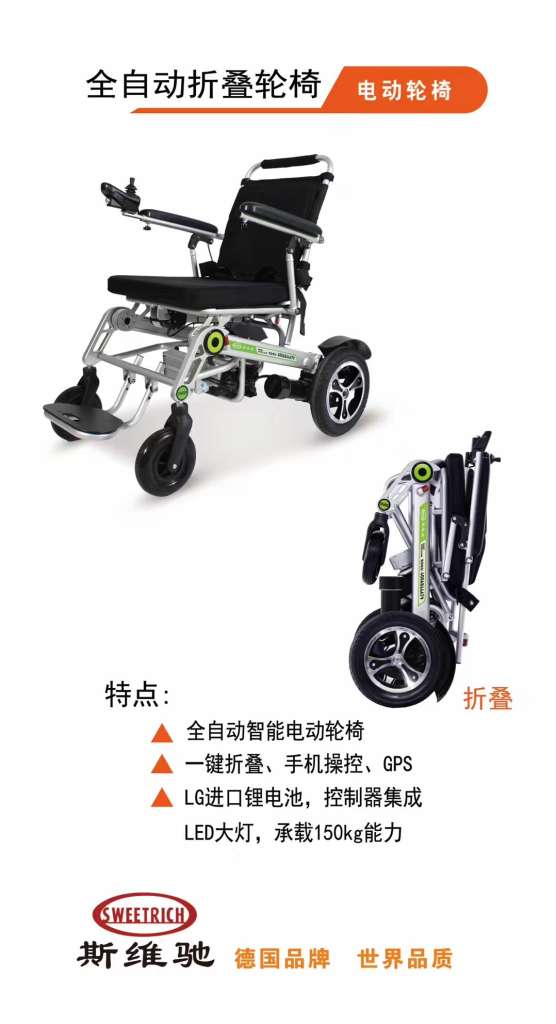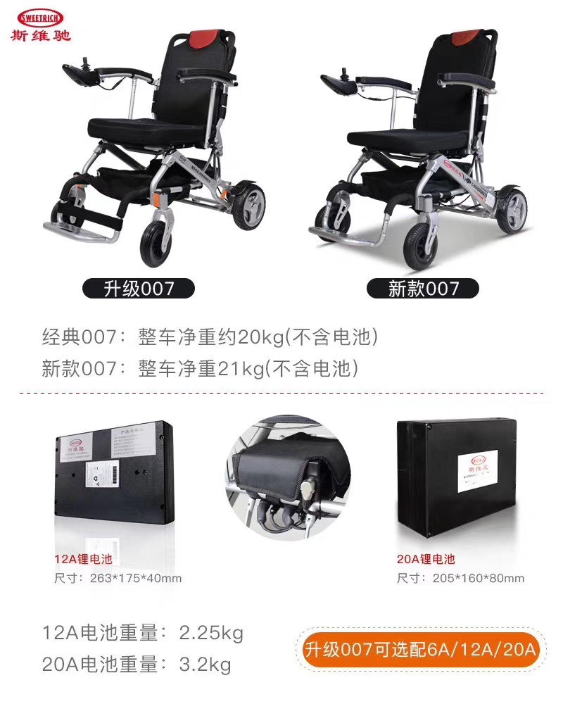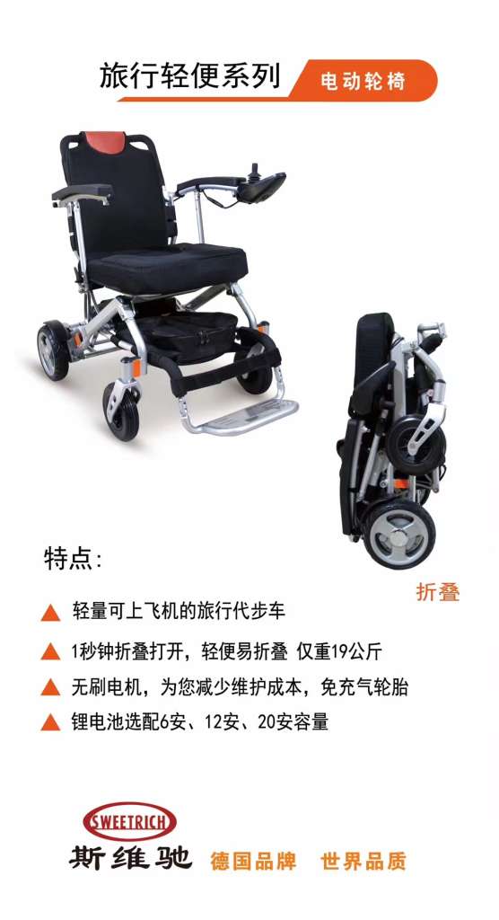 (2)、斯維馳SW6000-007輕便型電動輪椅,這款電動輪椅僅重19KG,可以上飛機。動力強大,多種規格鋰電池滿足不同場合續航需求,幾秒鐘就可以折疊起來,攜帶很方便,能夠滿足老年人日常使用的需求。