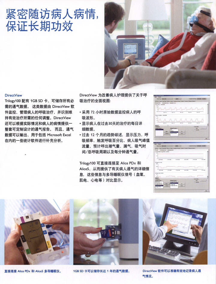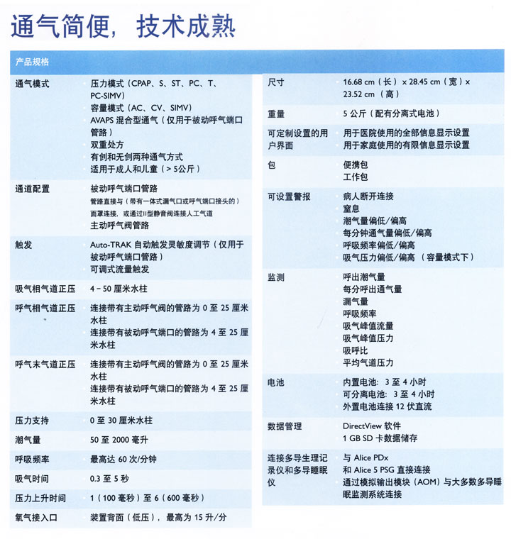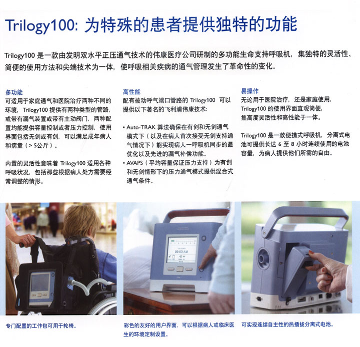 飛利浦偉康呼吸機(jī) Trilogy100 集有創(chuàng)-無(wú)創(chuàng)為一體的多功能生命支持呼吸機(jī)。適應(yīng)征:小兒(>5kg)到成人的急、慢性呼吸衰竭,急、慢性呼吸功能不全,阻塞性睡眠呼吸暫停病人的長(zhǎng)期通氣。多功能性 Trilogy100配備了2種不同的呼吸回路,即無(wú)創(chuàng)漏氣回路和有創(chuàng)主動(dòng)呼氣回路,Trilogy100能夠在容量控制或壓力控制通氣下進(jìn)行設(shè)置,并且能夠滿(mǎn)足有創(chuàng)或無(wú)創(chuàng)通氣的需求,使用范圍可從5kg的兒童到成人。 Trilogy100配備了2種不同的呼吸回路,即無(wú)創(chuàng)漏氣回路和有創(chuàng)主動(dòng)呼氣回路,Trilogy100能夠在容量控制或壓力控制通氣下進(jìn)行設(shè)置,并且能夠滿(mǎn)足有創(chuàng)或無(wú)創(chuàng)通氣的需求,使用范圍可從5kg的兒童到成人。 “雙處方”用于需要頻繁變換患者治療處方的呼吸道疾病,只需一鍵式切換就可調(diào)節(jié)至另一套處方進(jìn)行工作。高性能性如果設(shè)置為被動(dòng)呼氣回路,那么Trilogy100 就能夠?qū)崿F(xiàn)飛利浦偉康的以下出色技術(shù)功能: Auto-TRAK 數(shù)字式自動(dòng)追蹤靈敏度技術(shù)可在有創(chuàng)和無(wú)創(chuàng)通氣的壓力模式以及容量模式下確保最佳的患者-呼吸機(jī)同步化并實(shí)現(xiàn)最佳的漏氣補(bǔ)償功能; AVAPS (平均容量保證壓力支持) 混合通氣可在壓力模式下實(shí)現(xiàn),用于有創(chuàng)和無(wú)創(chuàng)通氣。簡(jiǎn)易性無(wú)論是在家中還是在醫(yī)院中使用,Trilogy100的全中文直觀界面能給用戶(hù)帶來(lái)更簡(jiǎn)便的使用、更強(qiáng)大的功能和更出色的性能。 Trilogy100 呼吸機(jī)在使用可拆卸電池的情況下的可以使用6 -8小時(shí),擁有出色的續(xù)航能力,更大程度的提高了患者使用的自由度。密切追蹤患者以確保長(zhǎng)期的療效。 Trilogy100 配備有一張1GB 容量的SD卡,能夠用于記錄和存儲(chǔ)所有重要的通氣數(shù)據(jù)。此類(lèi)數(shù)據(jù)可通過(guò)Directview 軟件進(jìn)行顯示。該軟件可有效管理患者的通氣治療并判斷出何時(shí)才有必要作出調(diào)整以維持有效的治療。DirectView 還可提供全套的通氣報(bào)告,據(jù)此可根據(jù)治療實(shí)踐和/或患者疾病情況對(duì)報(bào)告進(jìn)行定制。此外,通氣數(shù)據(jù)還可導(dǎo)出到其它統(tǒng)計(jì)應(yīng)用程序當(dāng)中進(jìn)行補(bǔ)充分析,其中就包括Microsoft Excel。 DirectView 可對(duì)呼吸治療進(jìn)行全面的評(píng)估并以此改善患者護(hù)理治療; 72小時(shí)的原始數(shù)據(jù)用于監(jiān)測(cè)患者每一次呼吸的波形; 每日詳細(xì)報(bào)告可顯示出患者在過(guò)去30天內(nèi)的治療情況; 過(guò)去12個(gè)月的趨勢(shì)報(bào)告概括可顯示壓力、呼吸頻率、呼吸觸發(fā)百分比、患者吸氣峰流量、呼出潮氣量、漏氣量、Ti/Ttot 以及分鐘通氣量等情況。