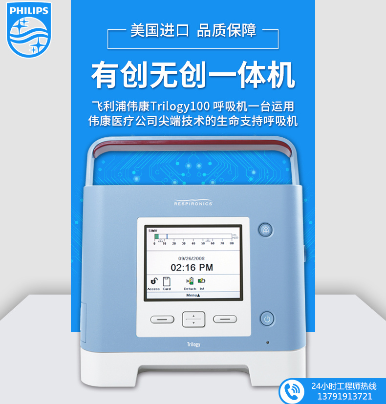 青島海逸醫(yī)療器械飛利浦T100呼吸機(jī) Philips Respironics Trilogy100 呼吸機(jī)系統(tǒng)可以為需要機(jī)械通氣的個(gè)人提供連續(xù)或間歇性的通氣支持。 Trilogy100 的適用對(duì)象是體重 5 公斤以上的兒童及成人患者,可以結(jié)合輪椅和輪床等移動(dòng)設(shè)備使用,并可以提供有創(chuàng)和無(wú)創(chuàng)通氣,配有雙鋰電池是可用作轉(zhuǎn)運(yùn)輸型呼吸機(jī)。